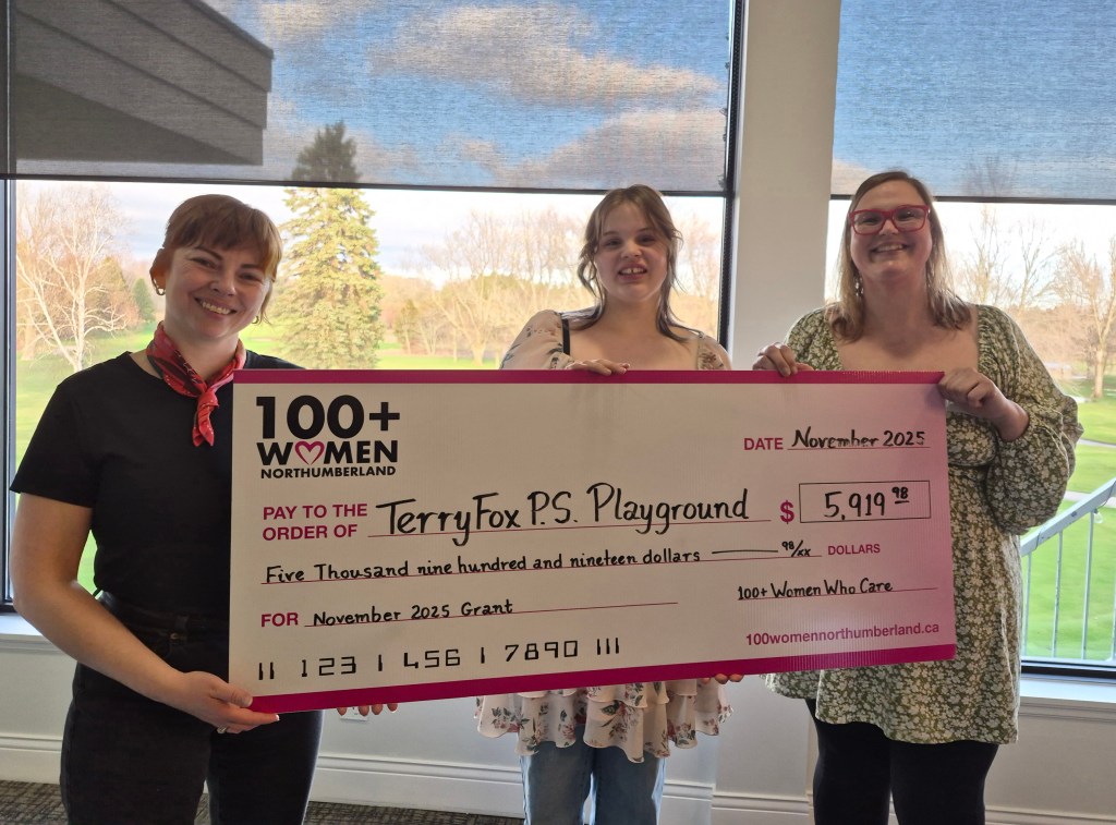 March 2026 – Cobourg, ON – Terry Fox Public School is honoured to receive the generous support of 100+ Women Who Care Northumberland with a grant donation of $5,919.98 to use towards expanding the playground equipment in our school yard. The Terry Fox Playground Committee and School Community Council have been working towards raising funds for this project since 2021, with a goal of promoting inclusivity and physical wellbeing for the children who use the equipment.
