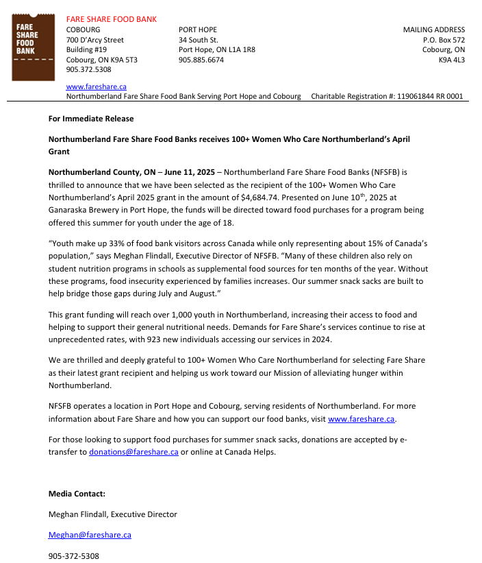 Modelled after the 100+ Women Who Care collective giving movement, the youth program invites children and teens to make a difference through simple, everyday acts of generosity. Free downloadable activity kits are available at 100womennorthumberland.ca/100-youth, offering creative ideas such as hosting a bake sale for charity, collecting school supplies, or writing thank-you notes to local helpers.